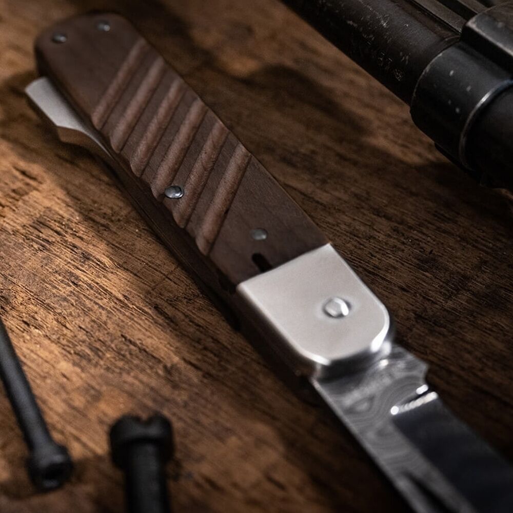Das Taschenmesser 98k-Damast greift verschiedene Designelemente des 98k-Bajonetts auf und ist zudem mit einer einzigartigen Damast-Klinge aus dem Laufstahl der Mauser-Karabiner ausgestattet. Der bemerkenswerte Damast wird von Chad Nichols von Hand im Muster Ripple geschmiedet. Die einzigartige Klinge mit ausgeprägter Fehlschärfe wird per Nagelhau geöffnet und von einem stabilen Backlock zuverlässig arretiert. Die Griffschalen aus heimischem Walnussholz nehmen die diagonal geriffelte Struktur der Bajonettgriffschalen auf und sorgen für sicheren Halt. Unter der Backe aus Stahl wurde zudem der Querstich zum seitlichen Reinigen des Schachtes der Putzstockaufnahme übernommen. Handgefertigt in der Böker Messer-Manufaktur Solingen. Mit edlem Schwebedisplay, Echtheitszertifikat und individueller Seriennummer.