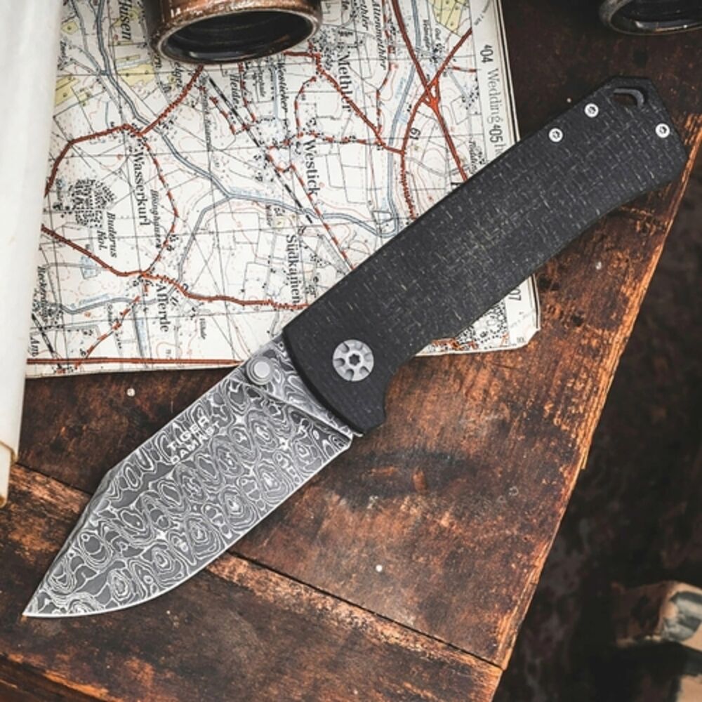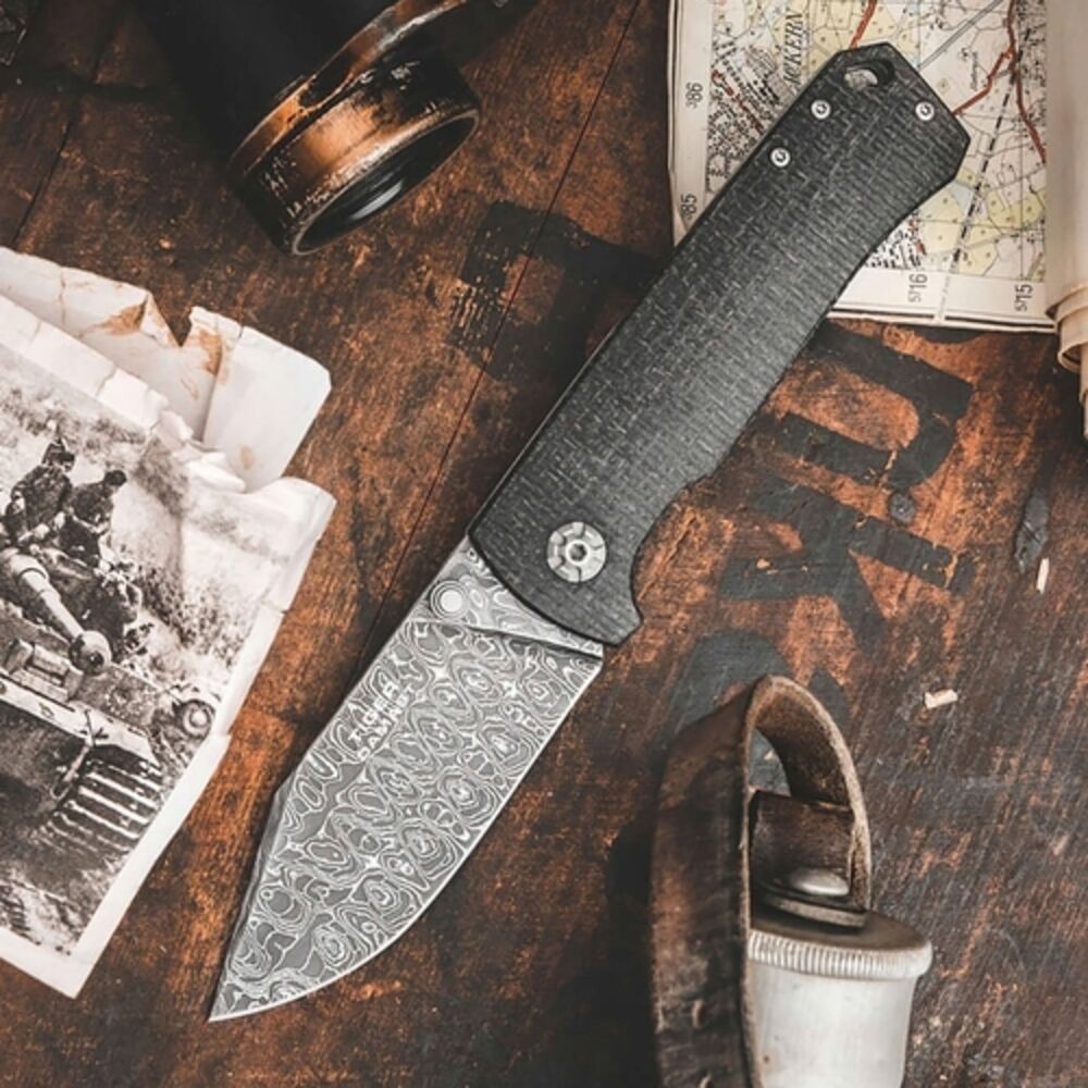 Das geradlinige Böker Tiger-Damast ist mit einer einzigartigen Damastklinge ausgestattet, die aus dem Stahl des bei Bauska zerstörten Kampfpanzers gefertigt wird. Der nicht rostfreie Mosaikdamast wird von Hand von Chad Nichols im Muster Intrepid geschmiedet und erinnert an die Panzerspuren, die von den schweren Ketten des Tigers im Boden zurückbleiben. Anders als bei herkömmlichem Damast werden bei der Herstellung von Mosaikdamast keine Lagen erzeugt, sondern komplexe Damastbarren in einem aufwendigen und sehr komplizierten Prozess von Hand zu einem Mosaik verschmiedet.