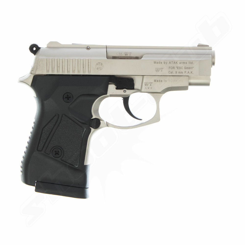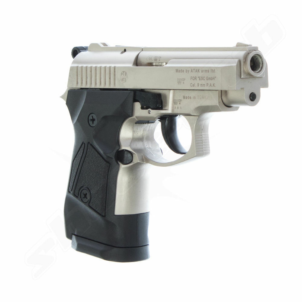 Diese moderne, kompakte Schreckschusspistole verfügt über einen ergonomisch geformtes Griffstück, stahlverstärkten Funktionsteilen und Single/ Double-Action Abzug. Noch vor wenigen Jahren war die Firma ATAK Arms aus der Türkei hier in Deutschland gänzlich unbekannt. Zulassungsbedingt war daher die Zoraki 914-P unseren Nachbarländern vorbehalten. Dies änderte sich aber 2011, als die Firma ESC den Import übernahm und für eine PTB Zulassung sorgte. Die anfängliche Skepsis gegenüber einer türkischen Schreckschuss Pistole verflog, als erste Erfahrungsberichte in Umlauf kamen. Diese stellten die Qualität auf eine Stufe mit Herstellern Umarex & Co. In Sachen Zuverlässigkeit zieht sie sogar an so manchem deutschen Konkurrenten vorbei. Bei der Zoraki 914-P handelt es sich um eine kompakte halbautomatische Gaspistole mit einer Magazinkapazität von 14 Schuss im Kaliber 9mm P.A.K.. Bei der satina Farbvariante werden schwarze Kunststoffgriffschalen verbaut. Die 914-P verfügt des Weiteren über eine manuelle Flügelsicherung sowie einen kombinierten Single-/Double Action Abzug.