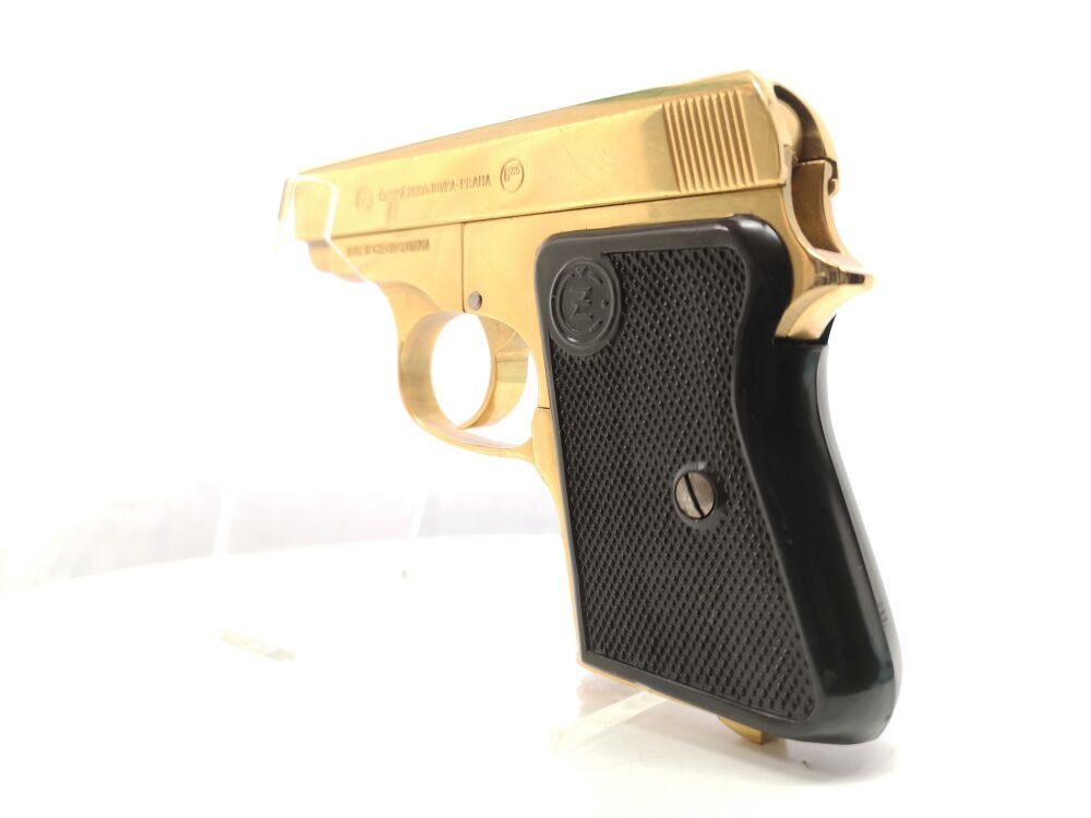 Besonderheit: seltenes Sondermodell der tschechischen Taschenpistole CZ Mod. 92 aus Sammlungsauflösung im Kal. 6,35mm Browning, goldfarben, mit schwarzen Kunststoffgriffschalen, Steckmagazin, verstecktem Hahn, technisch in Ordnung, Note 2 mit geringen Gebrauchsspuren, eher Note 1,5, für Sammler, Liebhaber oder für den Export *** voreintragspflichtig ***