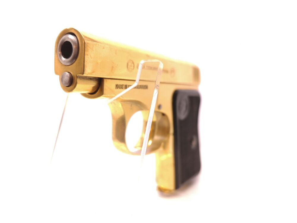 SHOP LINK N3913 CZ Uhersky Brod - Mod. 92 gold - Note 2 - seltenes Sondermodell der tschechischen Taschenpistole CZ Mod. 92 aus Sammlungsauflösung im Kal. 6,35mm Browning, goldfarben, mit schwarzen... ...weiterlesen