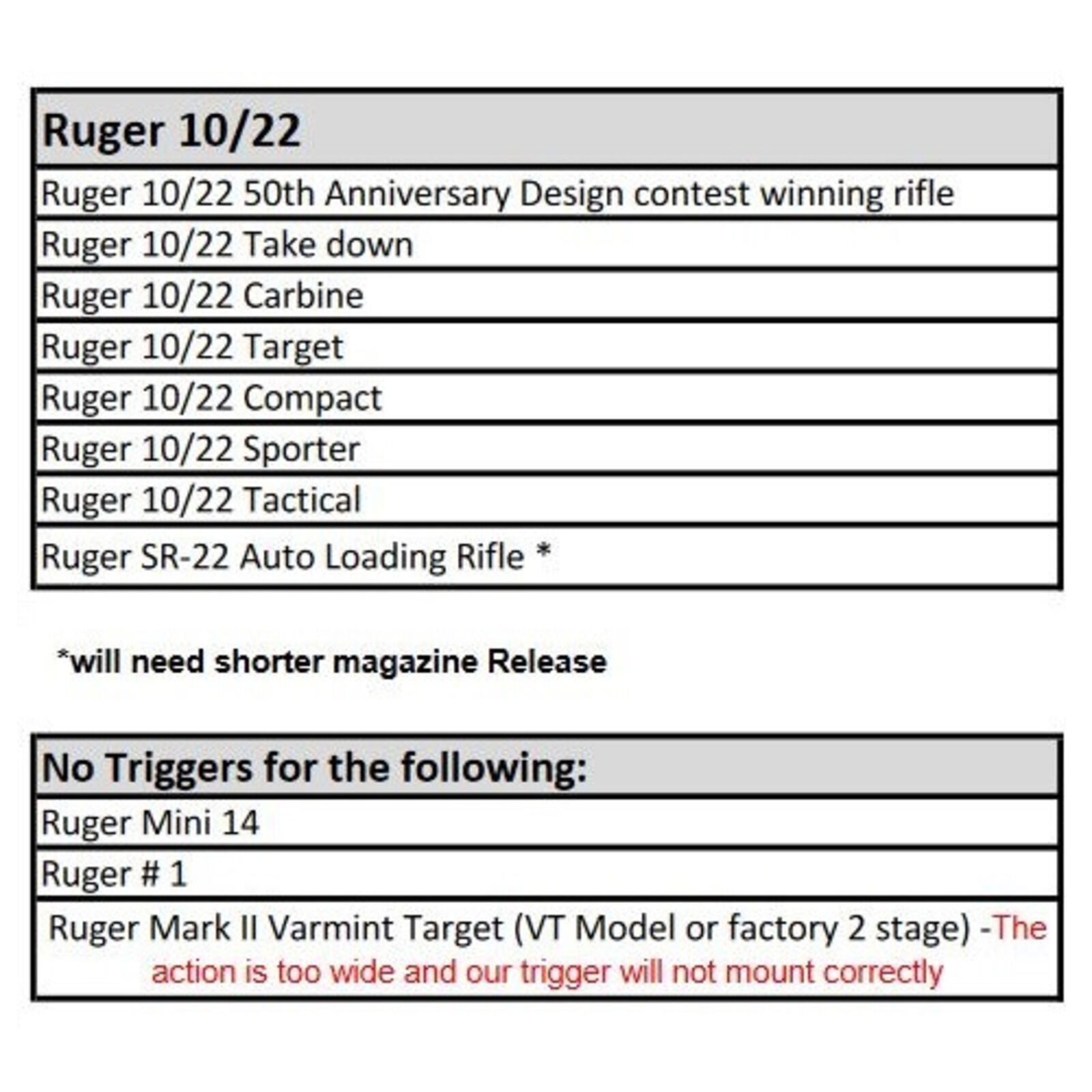 ha.Büchse/Rifle Ruger Modelle 10/22 siehe Tabelle unter Bilder und/oder Magnum Research Modell MLR 1722, komplettes Abzugssystem Gehäuse silberfarbig mit langem Magazinhebel und Abzugsschuh goldfarbig, Abzugsgewicht 2,75lbs/1.248gramm fest eingestellt ab Werk und ist nicht verstellbar, Code 1022-4C-16 Timney USA. Nacharbeiten sind in der Regel nicht erforderlich - eine fachgerechte Montage wird empfohlen! - Das Abzugsgewicht ist nicht verstellbar!