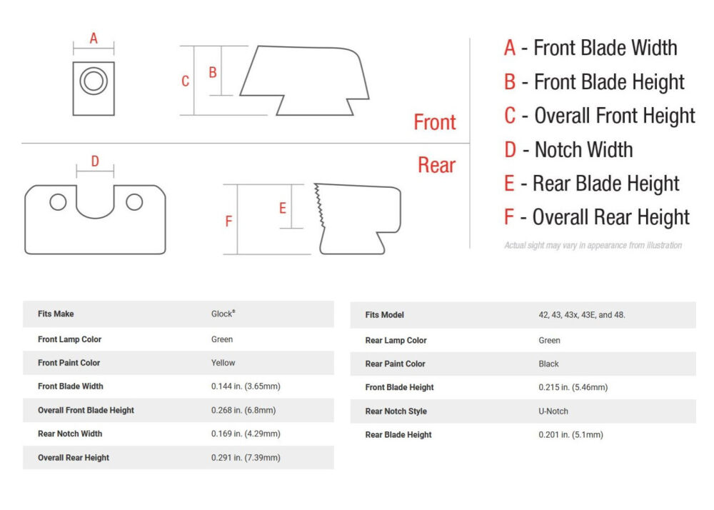 Pistole Glock Modell 42, 43, 43x, 43E & 48, Nacht Visierset grün/grün selbstleuchtend mit/und nur Visierkorn Dot gelb umrandet Daylight, Serie HD Tactical Shooter, breites Visierkorn und Visierblatt geriffelt mit breitem U-Shaped Notch schwarz, Code GL113 Trijicon USA. Nacharbeiten sind eventuell erforderlich - eine fachgerechte Montage wird empfohlen!