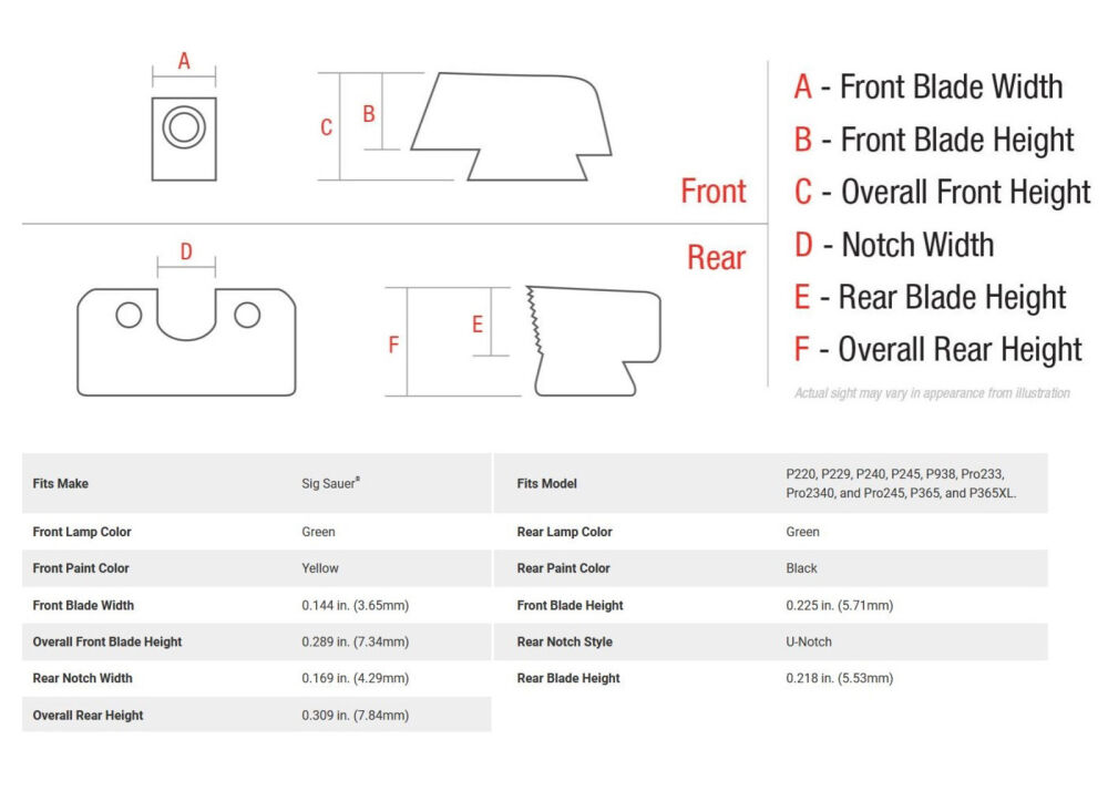Kaliber .40S&W & .45Auto, Pistolen SIG Sauer Modell P220, P229, P240, P245, Pro233, Pro2340, Pro245, P365 und/oder P365XL passt nicht für Modell SIG X-Five oder Six, Nacht Visierset HD selbstleuchtend Visier #8 grün mit Visierkorn #6 grün und Dot gelb umrandet, Code SG103Y Trijicon USA. Nacharbeiten sind eventuell erforderlich - eine fachgerechte Montage wird empfohlen!