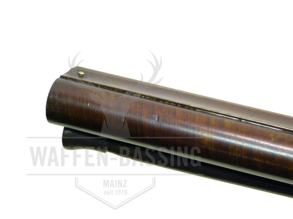 Diese Doppelflinte der Firma Richards Ltd. aus Burmingham (England) ist ein absolutes Sammlerstück. Die Querflinte mit Läufen aus Damaststahl und gebräunten Oberflächen-Finish ist eine historische Jagdflinte in hervorragendem Zustand. Die englische Perkussionsflinte in Kaliber 16 ist eine Vorderladerwaffe. Der Schaft aus Nussbaumholz ist mit einer gravierten Schaftkappe aus Metall abgeschlossen. Diese endet in einem eingelassenen Sporn auf der Schaftoberseite. Die Hähne lassen sich zunächst in der ersten Position zum Laden spannen, in zweiter Hahnstellung zum Schießen. Diese traditionelle britische Perkussionsflinte wird mit einem Messingperlkorn abgerundet.
