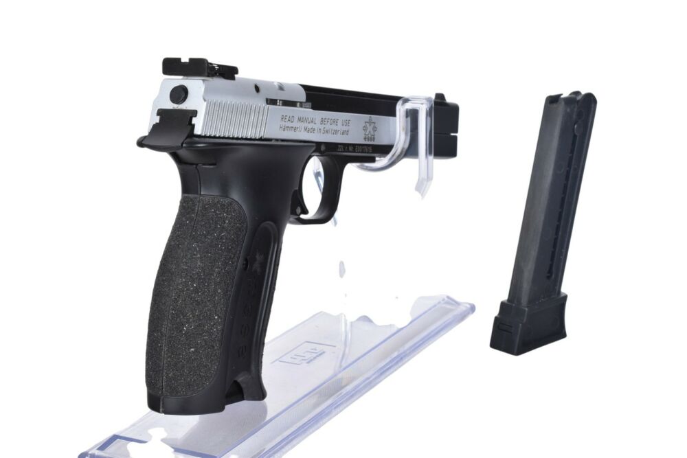 Diese Hämmerli X-Esse Pistole im Kaliber .22 LR Selbstladepistole befindet sich im Zustand 2, was normale Gebrauchsspuren sowie eine normale Schussbelastung bedeutet. Es können leichte bis mittelstarke Gebrauchsspuren wie kleinere Kratzer an der Brünierung oder Gebrauchsspuren an den Griffschalen vorhanden sein. Diese Zustandsbeschreibung gilt als generelle Einschätzung, sodass einzelne Abweichungen möglich sind.