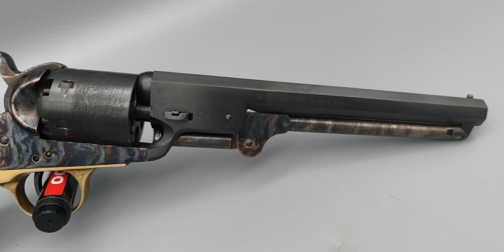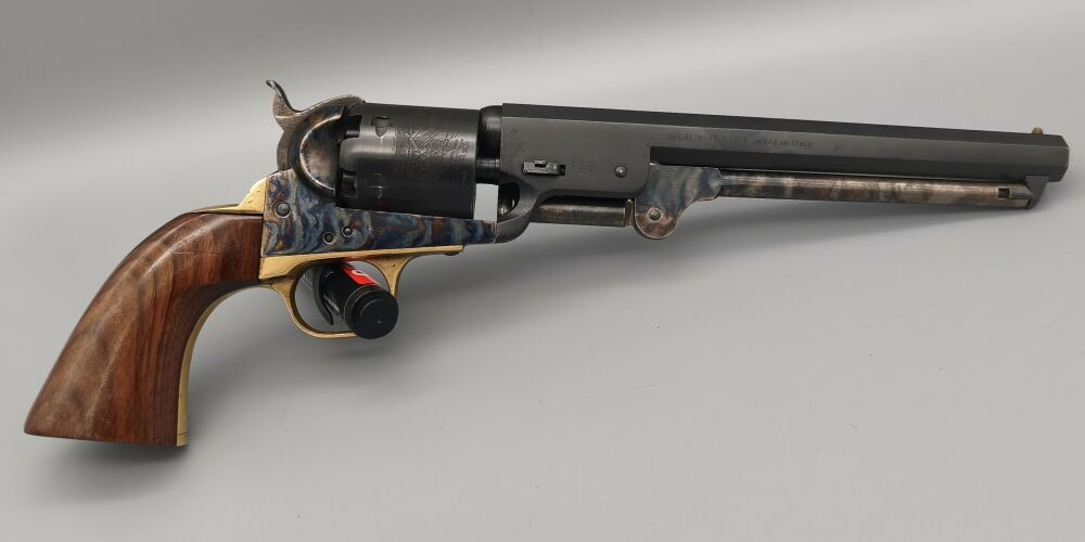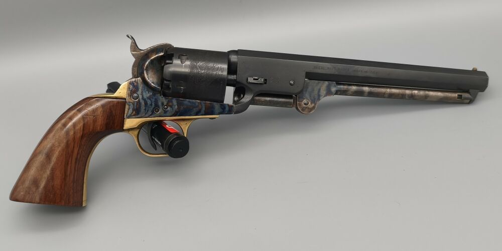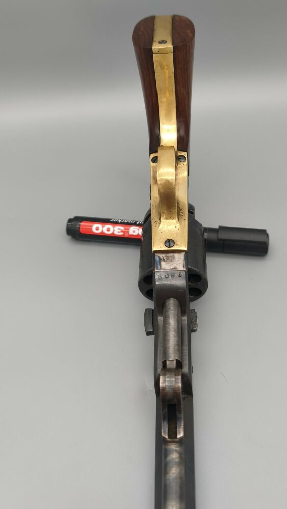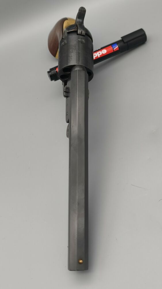 Percussionsrevolver in gutem voll funktionsfähigem Zustand. Kein Rost. Offensichtlich nicht sehr viel geschossen. Bunthärtung an den Stahlteilen. Gravur an der Trommel. Alles leichtgängig. ...weiterlesen