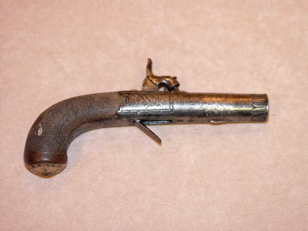 Lfl. 5,5 cm, Bj. ca. 1820; elegante Taschenausführung 15 x 7 cm, mit leichter Gravur und Monogramm des Vorbesitzers auf der eingelegten Silberplatte im Schaft, Klappabzug, Schlossfunktion muss überarbeitet werden, frei verkäuflich ab 18 Jahren...Rarität!...