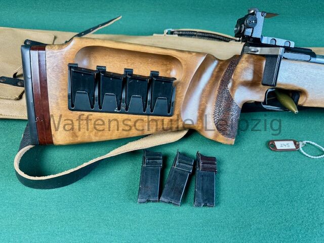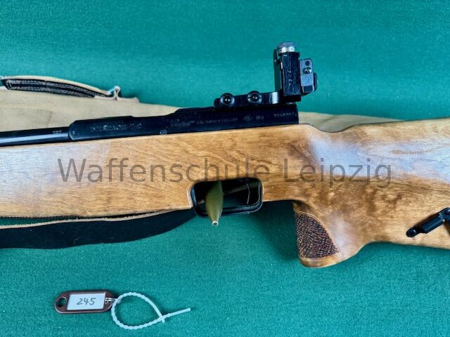 Geradezugrepetierer Kal. .22 lfB, Baikal Biathlon 7-2, Gesamtlänge 100 cm, 7 Ersatzmagazine, Dioptervisierung, Holzschaft, kaltgehämmerter Lauf, orig. Ledertasche, Zustand ist recht gut mit minimalen Gebrauchsspuren