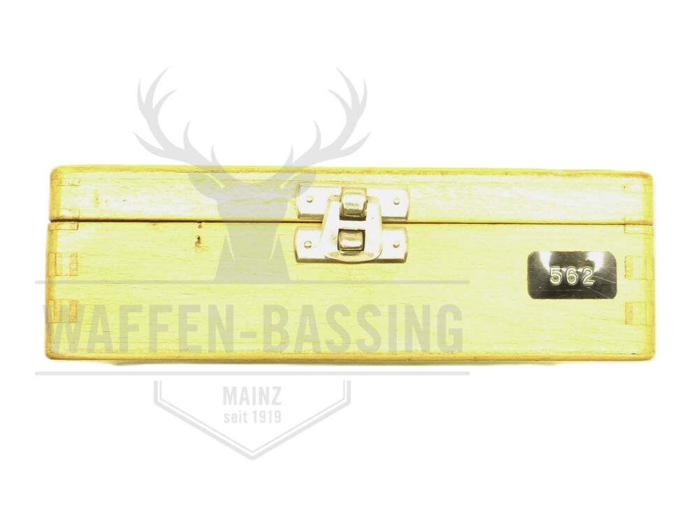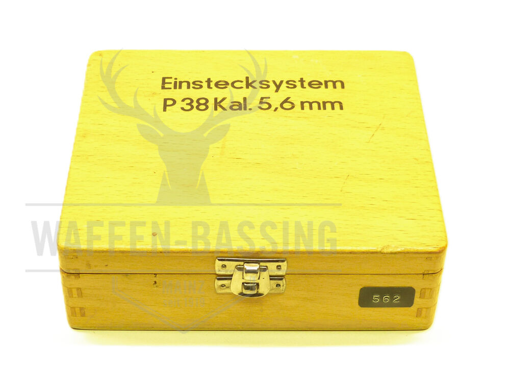 Das Walther Einstecksystem für die Pistolen P38/P1 der Firma Carl Walther aus Ulm im Kaliber 5,6mm (22LR) wird in Original Holzkassette geliefert. Im Lieferumfang enthalten sind 1 Lauf mit 55mm Lauflänge, 1 Verschlussstück und zwei Magazine aus Stahlblech mit einer Kapazität von je 8 Patronen. Auf dem Verschlussstück findet sich auf der rechten Seite das Baujahr „11/64“ als Gravur. Das Wechselsystem befindet sich in einem sehr guten Zustand und wurde Probegeschossen. Das Verschlussstück ist mit einer Kimme versehen.