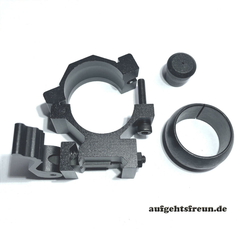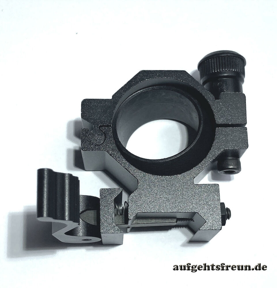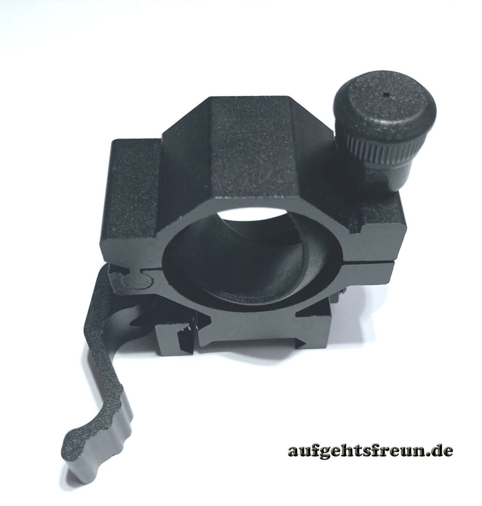 Lampenhalter, mit der die Lampe vom Winkel einstellbar ist und auf eine Picatinny / Weaver-Schiene montiert werden kann. Damit können auch andere Infrarotlampen mit 25,4mm (1") Mittelrohr montiert werden!