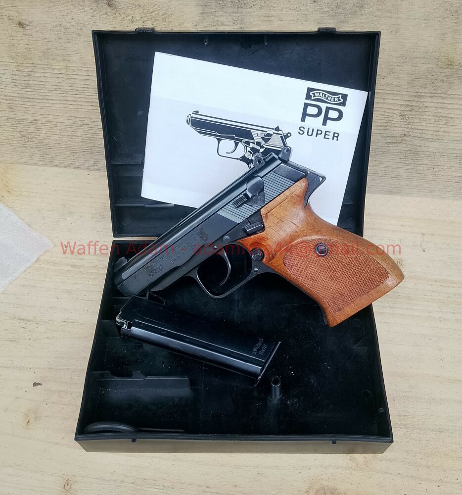 Original Walther PP Super Box (diese nicht ngl.) Ersatzmagazin, Reinigungsstock, Anleitung. Dienstwaffe der Polizei als Nachfolge zur Walther PP / PPk, da durch die Terrorlage mitte der 70er eine stärkere Bewaffnung erforderlich wurde und die Waffen in 9Para als zu bedrohlich angesehen wurden.  SNR: 16115 (1975?)