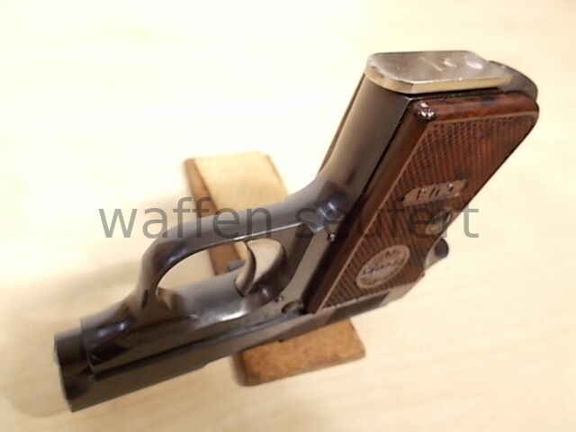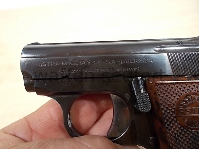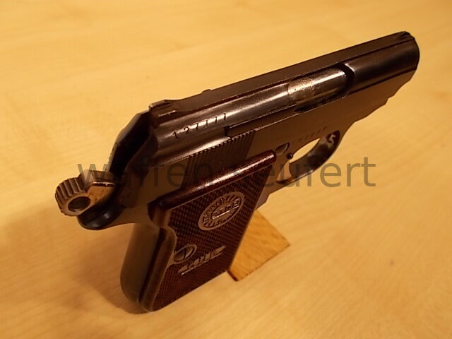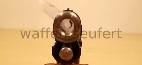 Astra CUB Sammlerpistole. Gefertigt 1963 in der berühmten Spanischen Waffenschmiede Astra. Klein und handlich mit außenliegenden Hahn zum Vorspannen auch als Fangschusspistole auf kleines Raubwild bis Mardergröße einsetzbar. Im Kaliber .22short balgschonend für die Fallenjagd. Laufprofil spiegelblank, Züge und Felder scharfkantig. Eines der erfolgreichsten Modelle von Astra. Hochwertig ausgestattete Taschenpistole mit außenliegenden Hahn, Magazinsicherung, seitlicher Sicherungs- und Zerlegehebel und Magazindruckknopf im Griffstück. Braune Kst-Griffschalen mit ASTRA Emblem und Schriftzug CUB. Magazin glanzvernickelt, Hahn und Abzug blank poliert. Beschriftung/Stempel: Schlitten links = ASTRA-Unceta Y CIA. S.A.-GUERNICA CAL. 22" SHORT MADE IN SPAIN. Gepflegter sehr guter Zustand. Mit Original Schachtel und Bedienungsanleitung. Kaliber: .22Short (.22Kurz). Beschuss: Eibar Spanien 1963. Lauflänge: 5,6 cm. Maße: ca. 11 x 8,4 cm. Gewicht: ca. 369 g. Zum Kauf dieses Produkts ist die Vorlage der Erwerbsberechtigung erforderlich!