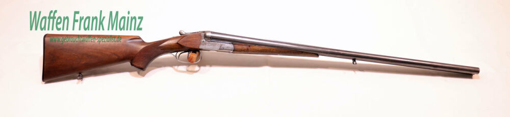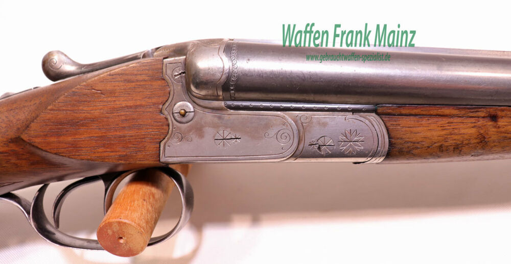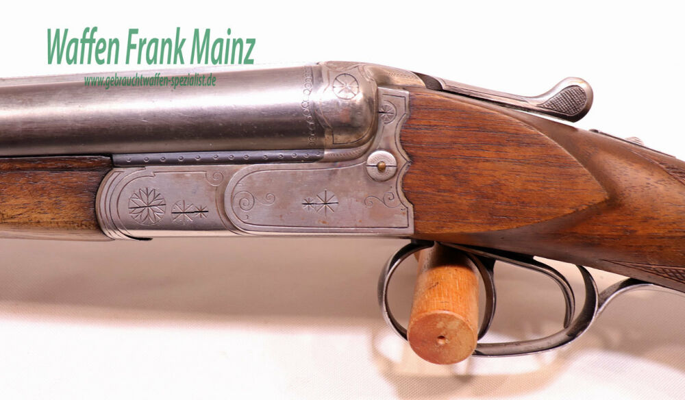 gut gepflegte Schrankwaffe, mit klassischem Suhler Anson-Schloß, mit seitlichen Signalstiften, massiver doppelter Laufhakenverschluss, mit Greenernase, noch mit zusätzlichen Stützwangen, Doppelabzug und Ejektor, Choke 1/2-1/1, klassische Schaftform mit deutscher Backe für Rechtsschützen, Schaftlänge 370mm, in Heimarbeit durch Büchsenmachermeister H.Kessel, Heidersbach Suhl für Bühag gefertigt (Bühag= Büchsenmacherhandelsgenossenschaft), Brünierung des linken Laufes teilweise blank gescheuert ....eine hochwertige, gefertigte Universal-Jagdflinte, noch mit guter Flintenlaufgeschoss-Schussleistung.....