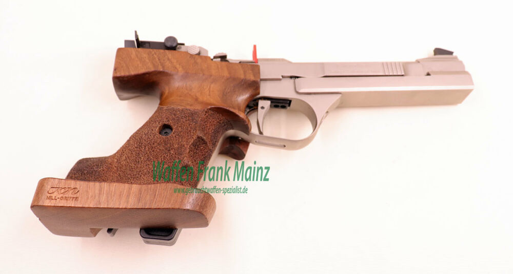 selten geschossene Schrankwaffe, in Ganzstahlausführung Stainless, mehrfach verstellbarer Matchabzug, verstellbares, tiefliegendes Mikrovisier, mit Nill Formgriff rechts Gr. M-L aus hochwertigem Wurzel-Nussbaumholz, herausnehmbares Stahlmagazin mit 5+1 Schuss....wohl die hochwertigste Sportpistole in .22lfb aus deutscher Fertigung....