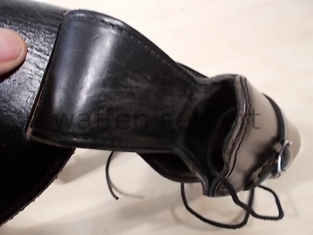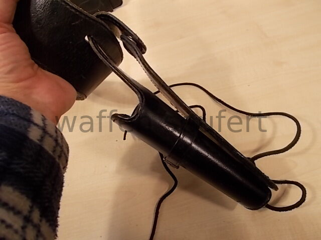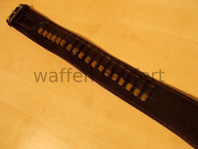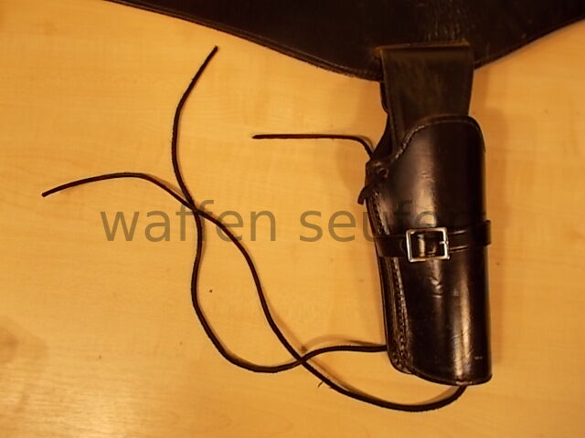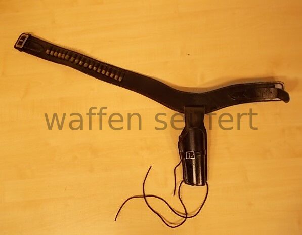 Bucheimer Westerngürtel mit Holster für 6 Zoll SAA-Westernrevolver, Patronenschaufen und Hülsen. Hochwertige Qualitätsarbeit aus den USA gefertigt in den 1980er Jahren vom Holsterspezialisten Bucheimer. Handgearbeiter schwarzer Westerngürtel aus starken Leder mit 18 Patronenschlaufen mit leeren Patronenhülsen und verchromte Metallschließe. Aufwändig verarbeitet und mit starken Garn genäht. Passgenau geformtes Holster mit großer Rückenplatte aus steifen Leder für Single-Action-Revolver bis 6 Zoll. Das Holster wird von zwei massiven Druckknöpfen gehalten ist abnehmbar und kann auch einzeln getragen werden. Größe M Bundweite: ca. 90 bis 98 cm. Gürtelbreite mit Patronenschlaufen: ca. 7 cm. Gürteldicke: ca. 5 mm. Gürtellänge bis: ca. 107 cm. Mit kleinen Gebrauchsspuren sonst gepflegter sehr guter Zustand