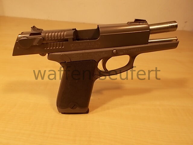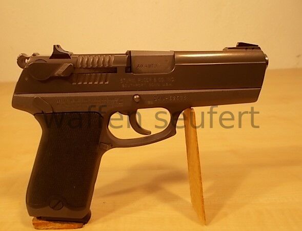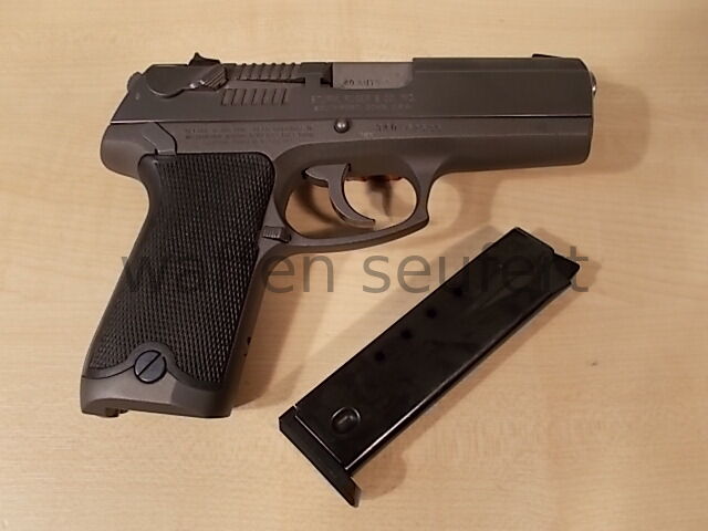 Ruger P94DC 40S&W Pistole. Fangschuss- und Jagdschutzpistole. Handliche Pistole mit leistungsstarken Kaliber. Großkaliberpistole für Polizei und Behörden in den USA entwickelt. Das Kaliber ist leistungsstärker als die 9mmLuger und damit auch für Jäger und Sportschützen interessant. Single- und Double-Action Version mit tief im Schlitten eingebetten Hahn und gerundeten Kanten um ein Hängenbleiben zu vermeiden. Die beanspruchten Teile sind aus Stahl das Griffstück aus gewichtssparenden Leichtmetall gefertigt. Laufprofil spiegelblank Züge und Felder scharfkantig.Visierung Kimme auf Schwalbenschwanz verschraubt und weiß eingefasst, Korn verstiftet mit weißen Zielpunkt für schnelle Zielaufnahme. Schlittenfanghebel, Entspannsicherung mit großen links/rechts Sicherungshebeln, Magazindruckknopf, verdeckter Hahn, herausnehmbares poliertes Magazin für schnellen Wechsel und flachen Griffschalen mit Fischhaut aus Hartgummi. Griffstück aus Aluminiumlegierung, Schlitten aus Stahl. Griffstück mattgrau eloxiert, Schlitten poliert grau. Praktisch neuwertiger Zustand. Kaliber: .40S&W (.40Auto). Beschuss: Mellrichstadt 1997. Lauflänge: 10,4 cm. Maße: 19,5 x 14,5 cm. Gewicht: 960 g. Zum Kauf dieses Produkts ist die Vorlage der Erwerbsberechtigung erforderlich!