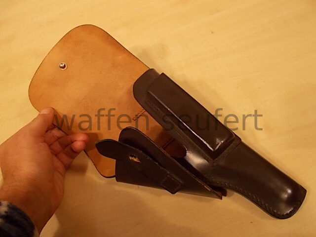 08 Koffertasche neu. Braunes Leder mit aufgenähten Magazintäschchen. Gefertigt in den 1980er Jahren. Gürtelholster sauber vernäht.Am Deckel kleine Gebrauchsspuren sonst gepflegter sehr guter Zustand.
