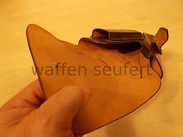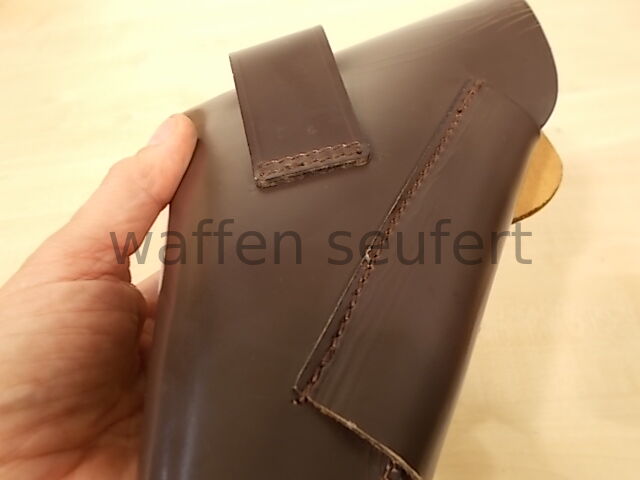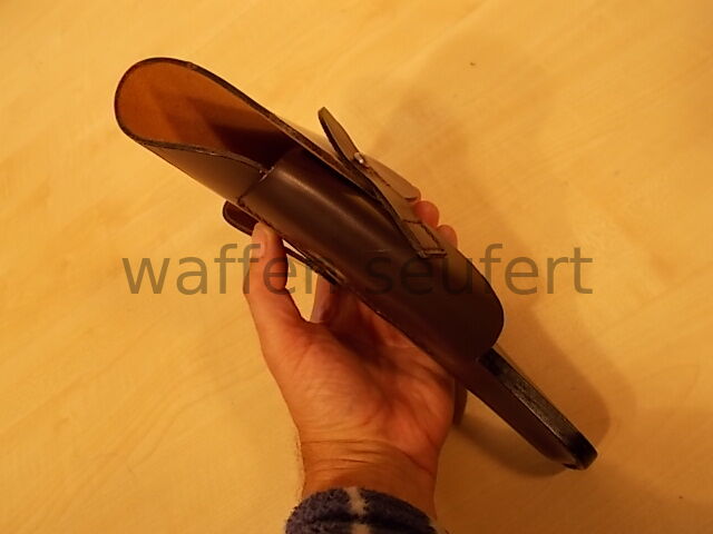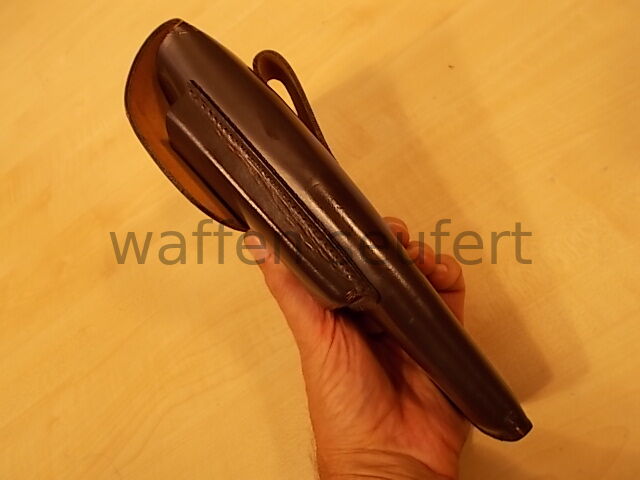 08 Koffertasche neu. Braunes Leder mit aufgenähten Magazintäschchen. Gefertigt in den 1980er Jahren. Gürtelholster sauber vernäht.Am Deckel kleine Gebrauchsspuren sonst gepflegter sehr guter Zustand. ...weiterlesen