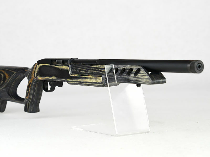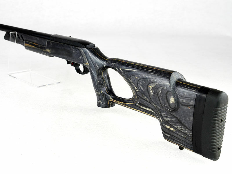 Die 10/22 Target Lite Thumbhole von RUGER ist eine halbautomatische präzise Kleinkaliberbüchse in extravaganter Optik. Durch die spezielle Stahl-Leichtmetall-Kombination des relativ dicken Laufs, bringt die TARGET LIGHT mit Ihrem schweren Schichtholz-Lochschaft dennoch nur 2,3 kg auf die Waage. Sehr gut ausbalanciert, dürfte das bei Dynamik-Disziplinen vielleicht eine kleinen Wettbewerbsvorteil bringen.