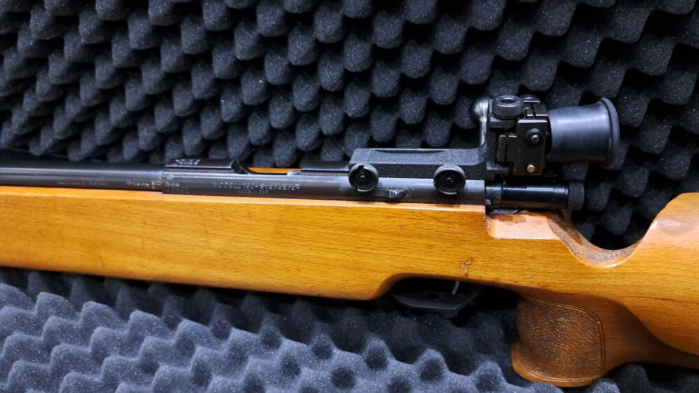 Das Suhl Modell 150 ist ein klassisches Matchgewehr aus der Fertigung des VEB Suhl und steht für solide Verarbeitung sowie bewährte Präzision. Der schwere Lauf mit 662 mm Länge sorgt für ruhiges Schussverhalten, während der fein einstellbare Druckpunktabzug eine saubere Auslösung ermöglicht. Der Schaft aus lackiertem Buchenholz mit Pistolengriff, Backe und verstellbarer Schaftkappe bietet eine angenehme Handhabung und guten Anschlag. Brünierte Stahlteile und die weiß polierte Kammer unterstreichen die hochwertige Ausführung. Eine 11 mm Schiene ermöglicht die Montage von Zieloptiken.