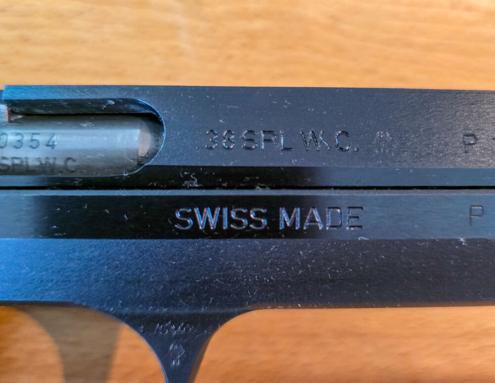 Schweizer Fertigung, entsprechende Markierungen vorhanden („SIG Hämmerli“, „P240“, „SWISS MADE“, „.38 SPL W.C.“).