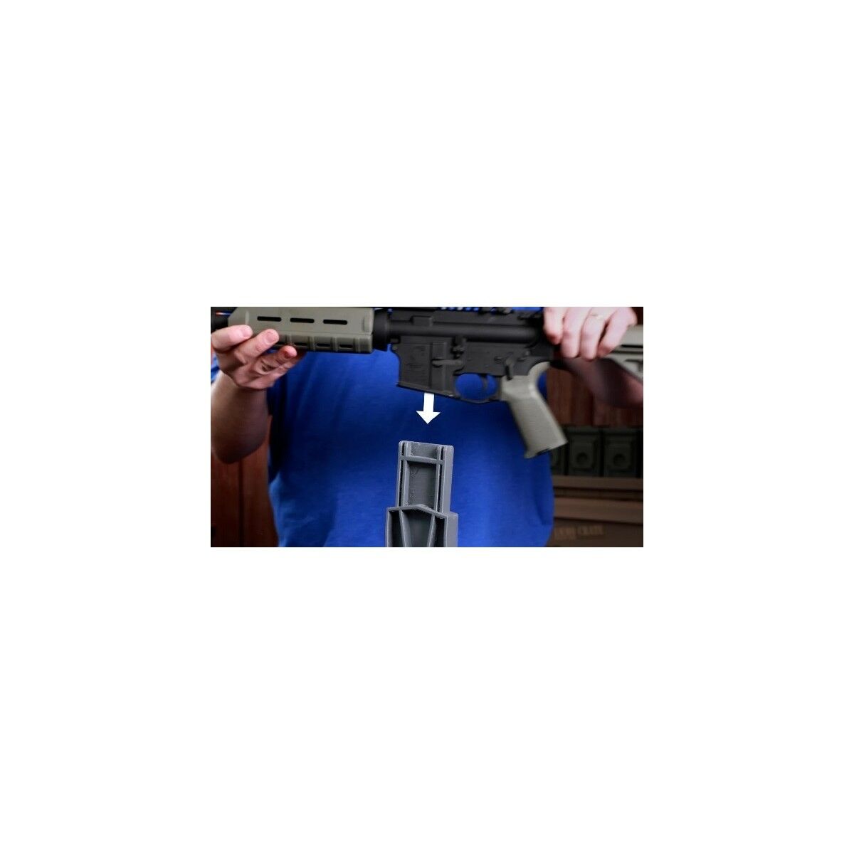 Kunststoffblock wir einfach in den Schraubstock eingespannt und die AR-15 oder AR-10 mit dem Magazinschacht aufgesteckt.