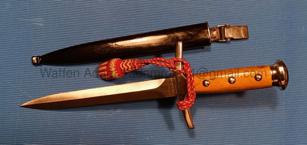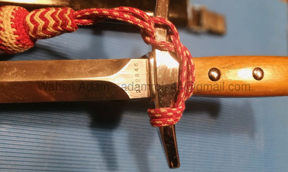 Ordonnanz Dolch für höhere Unteroffiziere, Fabrikat Elsener, Schwyz Modell Victorinox. Klassische zweischneidige Klinge, Parierstange und Knauf mit polierter Chrom Oberfläche. Edelholz Griffschalen mit sauberer Verschraubung. Nummerierung : 222846