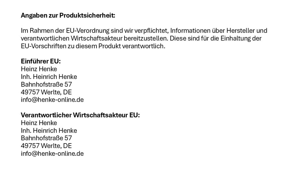 Im Rahmen der EU-Verordnung sind wir verpflichtet, Informationen über Hersteller und verantwortlichen Wirtschaftsakteur bereitzustellen. Diese sind für die Einhaltung der EU-Vorschriften zu diesem Produkt verantwortlich.