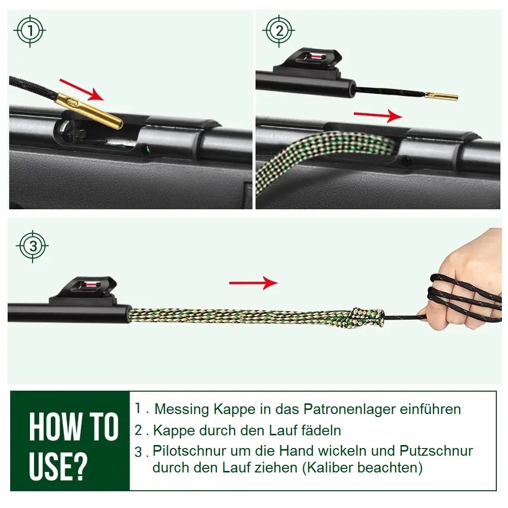 Die Putzschnur ermöglicht es Ihnen, Ihre Kurz- und Langwaffenläufe mühelos zu reinigen. Die Messingkappe wird einfach von hinten durch den Lauf gefädelt, die Pilotschnur fest gegriffen und die Putzschnur durch en Lauf gezogen.