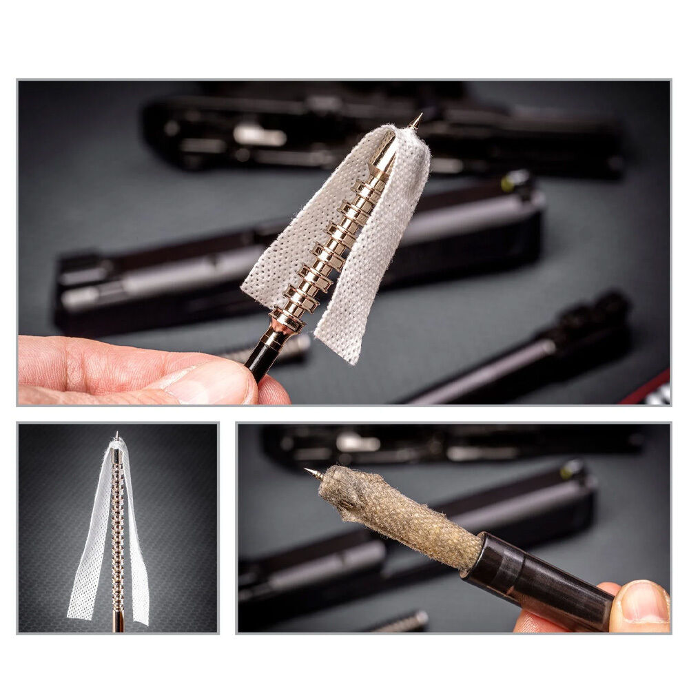 Die Real Avid Bore-Max Speed Jag & Patches ist ein Tool zur Laufreinigung von Waffen. Die Spitze wird in Kombination mit den Bore-Max Speed Patch verwendet. Mit diesem Duo erreicht man eine sehr viel höhere Reinigungswirkung als bei herkömmlichen Tools für Patches. Dieser Effekt wird unterstützt von den rechteckigen statt oftmals quadratischen Patches. Sie schmiegen sich über die gesamte Länge des Tools und kommen so dem Waffenlauf bis zu 4x näher als vergleichbare Tools und Patches. Das Gewinde ist kompatibel mit dem Real Avid Bore-Max Smart Rod. Ein ergonomischer Handgriff mit Putzstock, der kugelgelagert sich mit der Laufkontur bewegt.