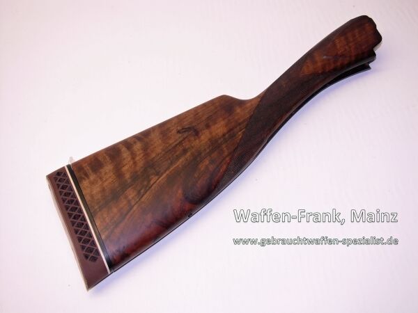 Bj. ca. 1980; original Fischbauchschaft, passend für Mod. B25 Spezial Jagd, aus hochwertigem Wurzelholz Klasse 5, mit noch scharfer Fischhaut, Schaftlänge einschl. brauner Gummikappe gemessen von Schaftwange bis Schaftkappenspitze oben 40,5 cm
