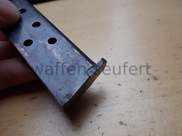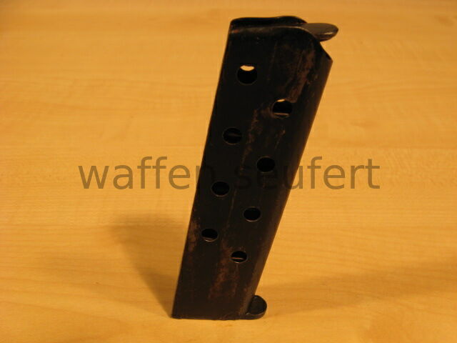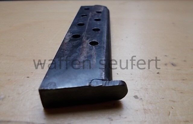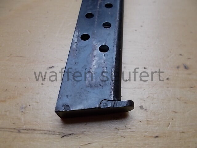 FN 1910/22 Ersatzmagazin für halbautom. Pistole. Ersatzmagazin für 9 Zentralfeuer-Patronen Kaliber 7,65mmBrowning (32ACP) Original, einreihig, Brünierung teilweise abgeschliffen, Funktion noch gegeben aber an der rechten Seite des Körpers zum Magazinboden kleiner Einriss sollte gelötet werden. Stempel nicht mehr zu erkennen.