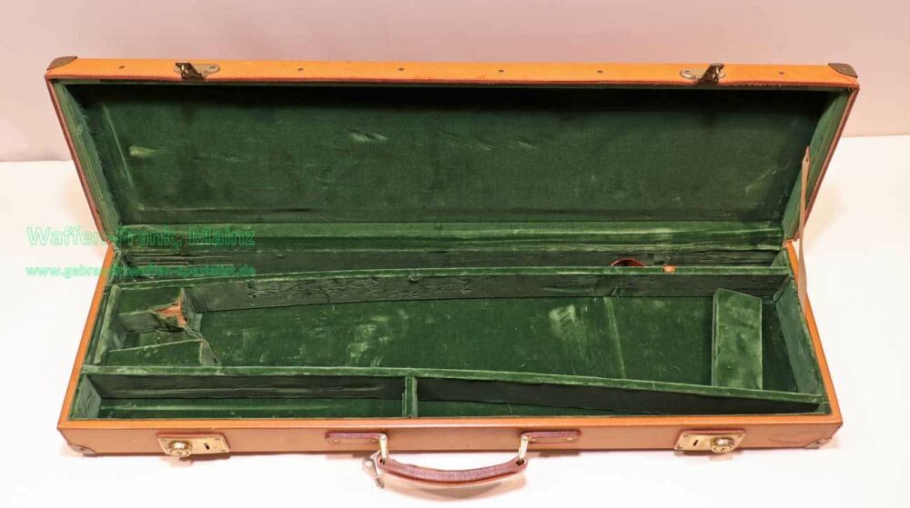 klassischer Holzkoffer mit hellbraunem Lederbezug, Monogrammschild, Kantenschutz und zwei abschließbare Schlösser messingfarben, mit Inneneinteilung für Kombinationswaffen mit Lauflänge bis 76cm, mit grünem Filz ausgeschlagen