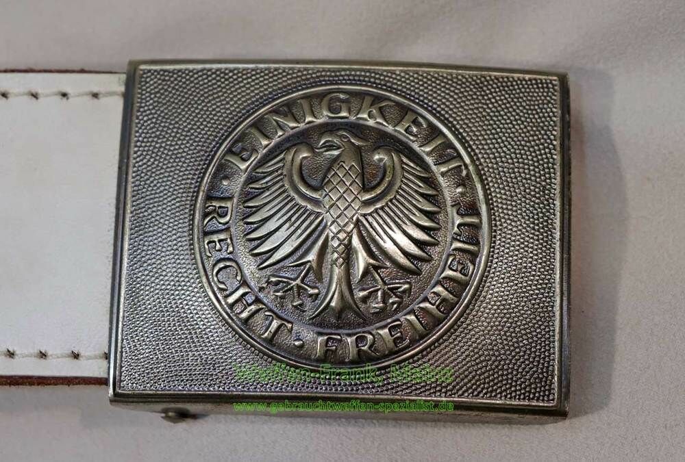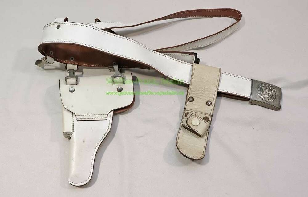 Original noch nicht benutztes Komplette Trageausrüstung in weiß(für Militär Polizei und Ehreneskorte) für Pistole P1/P38 mit Gürtelschließe(Bundesadler mit einprägung (Einigkeit/Recht/Freiheit) und Tragekoppel,sowie gebrauchte Schlagstockaufnahme. Rarität: € 198.-