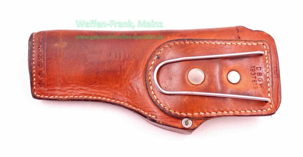 Gürtelholster aus braunem Leder mit Federspange aus Metall, die Waffe wird gehalten durch eine eingearbeitete massive Stahlblechfeder, passend für Colt 1911