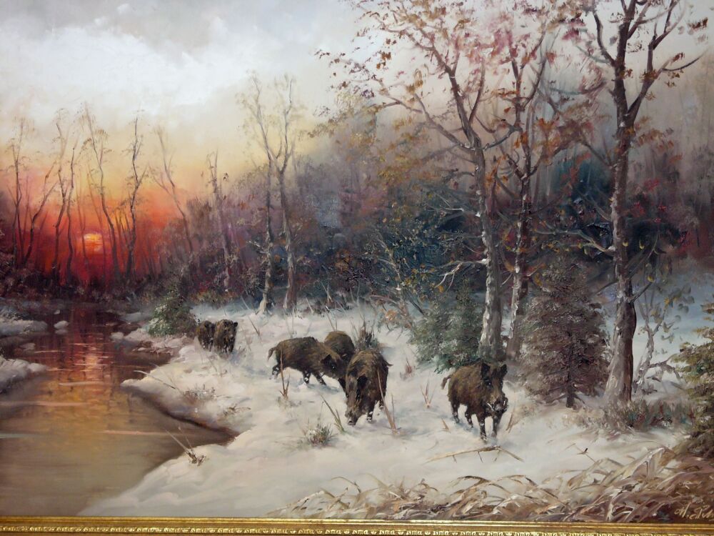 Jagdgemälde mit Schwarzwild, gemalt ist dieses vom Kunstmaler Werner Scholl (Bergisches Land, geb. 1911 - gest.1980)