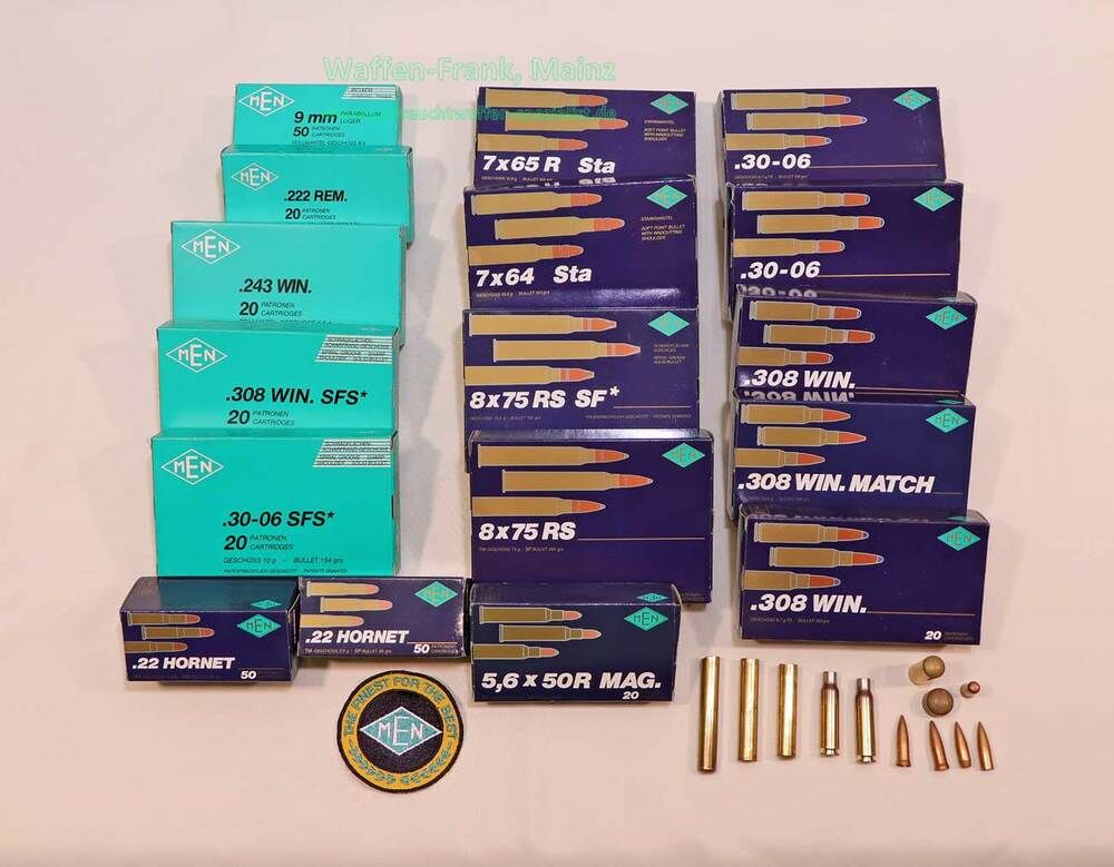 komplette Mustersendung von Dekomaterial bestehend aus 17 Original Werksverpackungen des aktuellen Angebots mit jeweils einer Deko-Musterpatrone (ungeladen, daher frei ab 18 Jahren), sowie diverse Hülsen und Geschosse aus den jeweiligen Rohfertigungsschritten und entsprechendes Prospekt-, Ballistik- und Bildmaterial....als Konvolut EUR 69,-