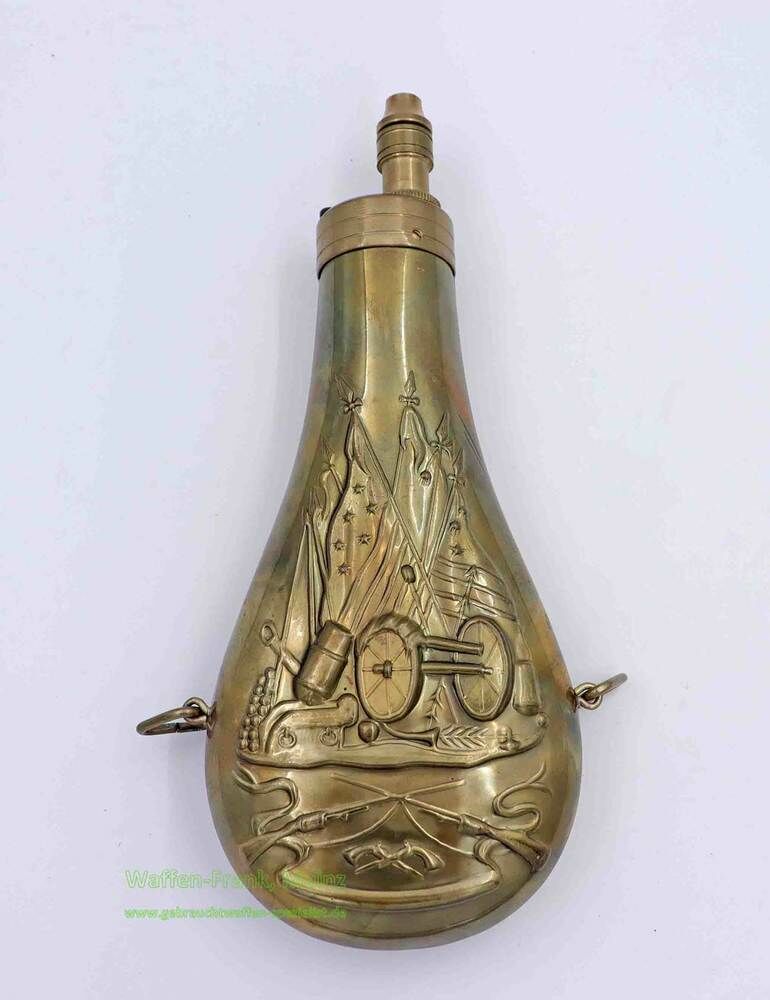 Der Pulverflasche ist aus Messing mit dem beidseitig geprägten Emblem "Kanone und Fahnenständer". Sie fasst ca. 12 oz Schwarzpulver und hat einen verstellbaren Ausguss mit Druckfunktion. Ein notwendiges Zubehör für Ihren Colt Walker oder Colt Dragoon Revolver.