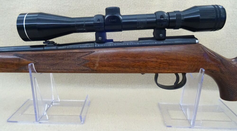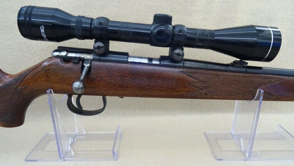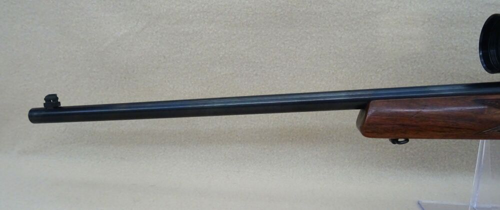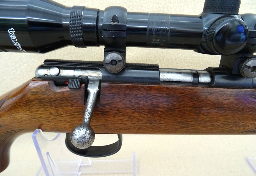 Der Repetierer des Hersteller Anschütz im Mod.66, im Kal. 22 Magnum ist in einem Holzschaft mit Backe und Monte Carlo Effekt gefertigt. Auf der Waffe ist ein ZF des Hersteller Tasco.