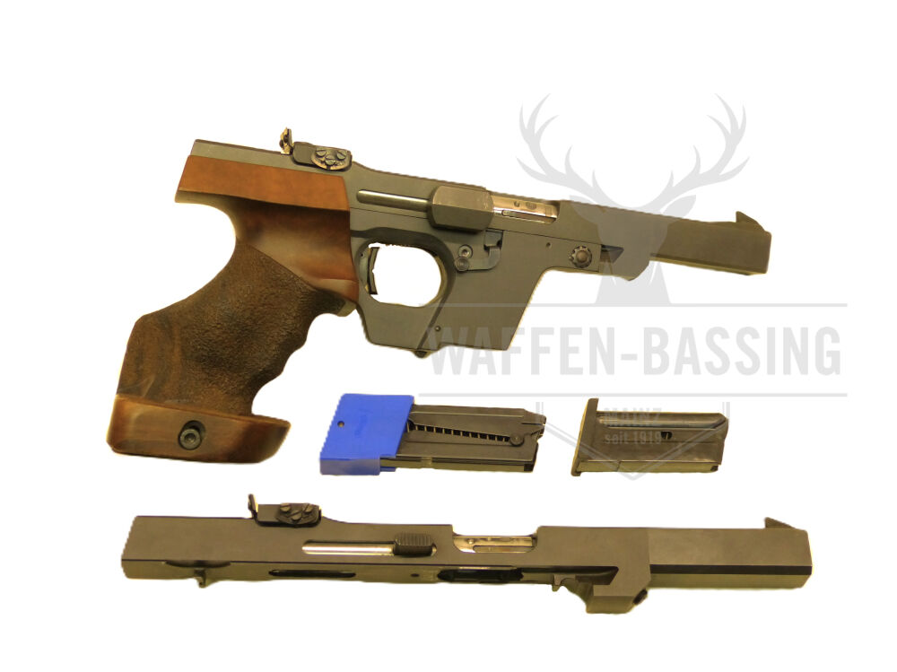 Der beidseitig angebrachte Verschlusshebel bietet eine sehr gute Grifffläche, um den Verschluss geschmeidig zu öffnen. Der rechts liegende Verschlussfangriegel lässt sich sehr gut mit dem Zeigefinger der rechten Hand feststellen oder lösen. Das Magazin hat eine Kapazität von 5 Schuss. Diese Kurzwaffe wurde mit absoluter Präzision hergestellt, um bei Wettkämpfen höchste Wiederholgenauigkeit bei hoher Schussleistung zu gewährleisten. Im Lieferumfang enthalten ist ein original Walther Wechselsystem im Kaliber .22lr (inkl. 5-Schuss-Magazin). Beide Kaliber dieser GSP Sportpistole wurden wenig geschossen und befinden sich in einem entsprechend sehr guten Zustand.