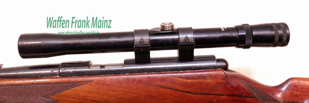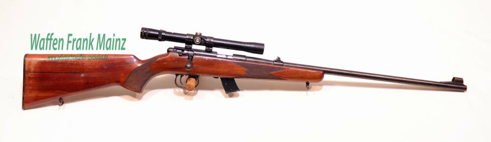 klassischer Kurvenspanner, mit herausnehmbarem 10+1 Schuss Stahlmagazin, deutscher Stecher, Klappenvisier, gut gemaserter Nussbaumschaft mit deutscher Backe für Rechtsschützen, Schaftlänge 365mm, mit Riemenbügel, mit ZF Hunter 4x20 Abs. Fadenkreuz...für geräuscharmen jagdlichen Einsatz (Spezialmunition dafür ab Lager)....