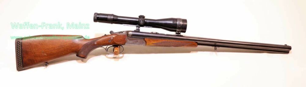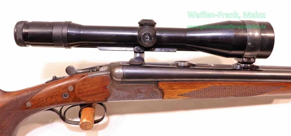 mit klassischem Dreispanner-Blitzschloßsystem, linksseitige Greener-Sicherung und Signalstifte, Suhler-einhakmontage mit ZF Zeiss diavari-Z 2,5-10x52 Absehen 4 (generalüberholt), klassischer Nussbaumschaft mit deutscher Backe für Rechtsschützen, Schaftlänge 360mm, fachlich perfekt reparierter älterer Schaftschaden im Schafthalsbereich, mit dreifacher Verschraubung, Kimmenblatt fehlt