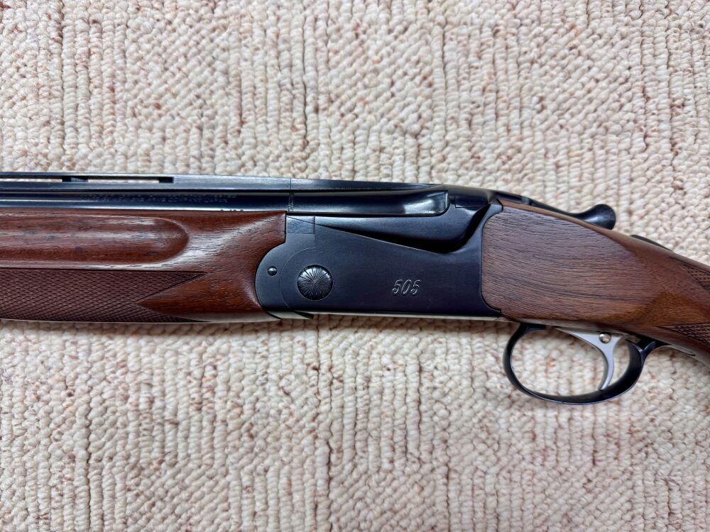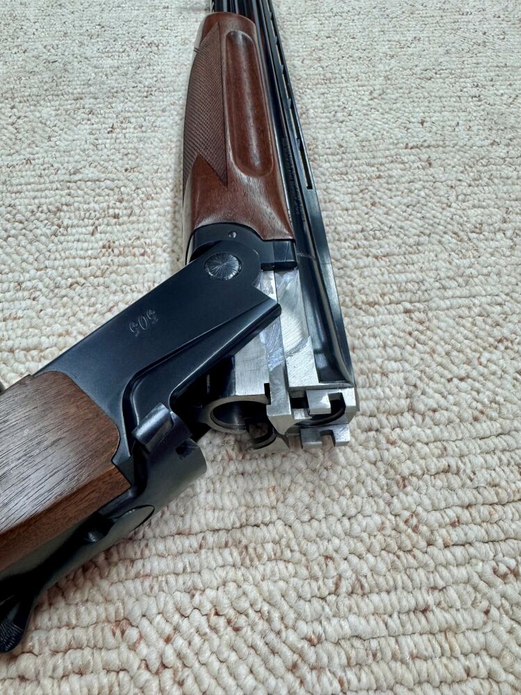 Es handelt sich um eine Bockdoppelflinte von SKB im Kaliber 12/70 mit Wechselchokes.