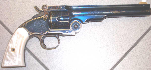 Uberti Schofiled 2nd Modell, Kal.45 LC, Sondermodell, Gravur, Goldeinlage, Sondergriff Polymer-Perlmutt, werksseitig geprüfte Schußleistung, Neuwaffe; Versand nur mit persönlicher Zustellung (35,00 €) möglich, Erwerbsberechtigung erforderlich