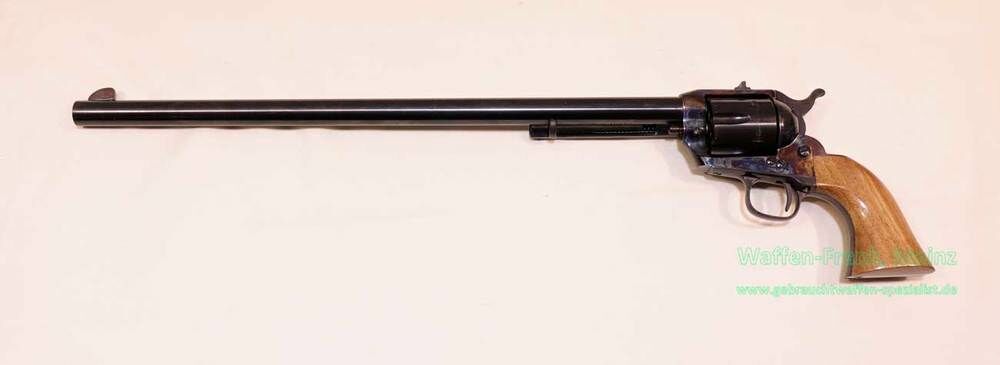Hochwertiger Colt Frontier Buntline Special Peacemaker Revolver mit extralangem 16,5 Zoll Lauf aus Armi-Jäger-Fertigung. Den Namenszusatz "Frontier Buntline" hat dieser Revolver vom Typ Single Action Army der Überlieferung nach einer schillernden und berüchtigten Persönlichkeit namens Edward Z.C. Judson zu verdanken. Unter dem Pseudonym Ned Buntline gilt Judson als einer der besten Groschenroman-Autoren aus der "Zeit des Wilden Westens" aber auch als berüchtigter Hochstapler und Betrüger. So wird überliefert, dass er u.a. mehrere spezielle, extralange Colt SAA 1873 (mit seinen Initialien graviert) von der Firma Colt erhalten hat, welche er, nach eigener Aussage, u.a. Wyatt Earp überreicht habe. Durch Buntline's Berühmtheit und die weitverbreitete Legende um seine Revolver, werden diese seltenen, extralangen Peacemaker Revolver oftmals als "Frontier Buntline" bezeichnet. Diese Revolver mit einer Lauflänge von 12 - 16,5Zoll sind heute begehrte Sammlerstücke und stehen nur äußerst selten im Original zum Verkauf. Angeblich wurde dieses Modell so vom Autor Ned Buntline in Auftrag gegeben. Dieses zum Verkauf stehende "Colt"-Replik ist eine nahezu detailgetreue Nachbildung des Originals von 1873 im "moderneren"-Kaliber.