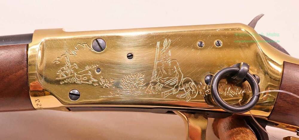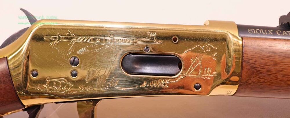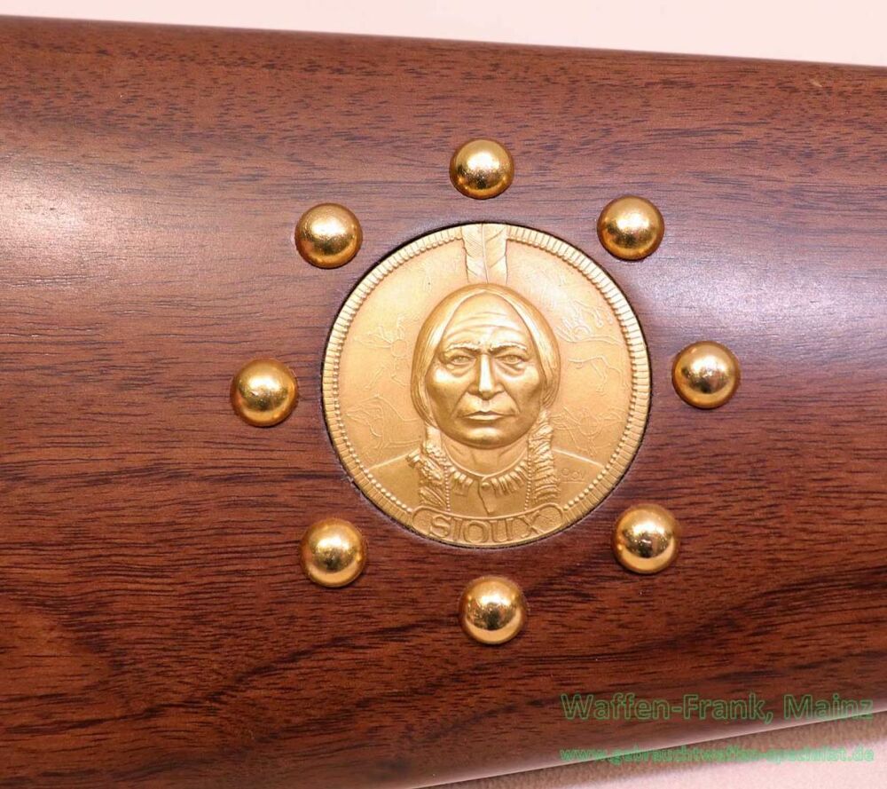 ungeschossen, aus Sammlungsauflösung, mit gültigem Beschuss, 6+1 Schuss Röhrenmagazin unter dem Lauf, brünierter, runder Lauf, höhenverstellbares Buckhorn-Visier mit Perlkorn, vergoldeter Systemkasten, Unterhebel und Vorderschaftsabschluß, in den Seiten des Systemkastens je eine Rollgravur in Form einer Indianerszene, Modellbezeichnung am Lauf und in der Systemscheibe, mit Sattelring, Schaft aus gut gemasertem Nußbaumholz, auf der rechten Hinterschaftsseite ein eingelegtes und von vergoldeten Nägelköpfen umrahmtes Medaillon mit Indianerportrait, aus den ersten limitierten Sonderfertigungen noch aus New Haven.....Einzelstück EUR 1445,-