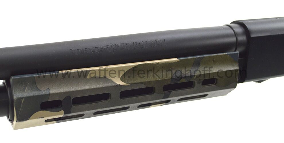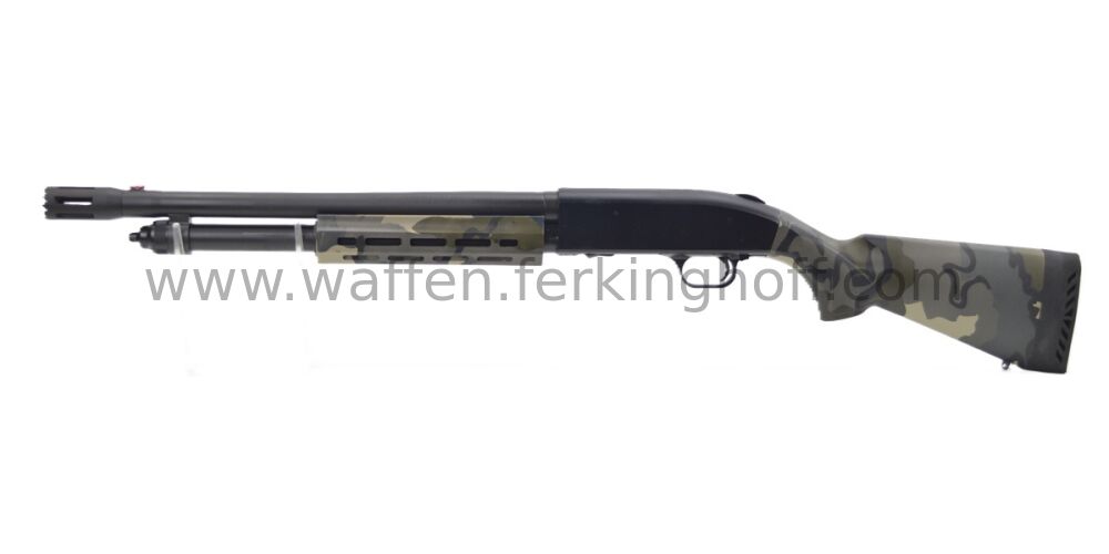 Caliber 12/76, Model 590 Thunder Ranch Breacher Rep.Shotgun 5+1 Rounds, barrel length 18.5Inch/47cm with breacher muzzle brake, matte black, drilled and tapped receiver, front sight fiber, Kuiu Camo synthetik stock und M-Lok forend, recoil pad, total length 37.6/95.5cm, Choke Cylinder Bore, CIP Steel Shot Proof Test, total weight 6.75lbs/3.065grams, Code 85331 Mossberg USA. Sale as long as available - Unique Piece only - Limited First Production - Show Gun!