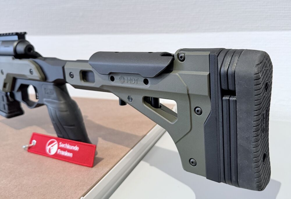 Dieses moderne Präzisionsgewehr ist in einem MDT-Aluminiumchassis in mattem Oliv aufgebaut und vereint hohe Stabilität mit funktionalem, taktischem Design. Der verstellbare Hinterschaft mit rutschfester Gummischaftkappe ermöglicht eine individuelle Anpassung an den Schützen und sorgt für einen sicheren Anschlag. Der M-LOK-Vorderschaft bietet umfangreiche Möglichkeiten zur Zubehörmontage.