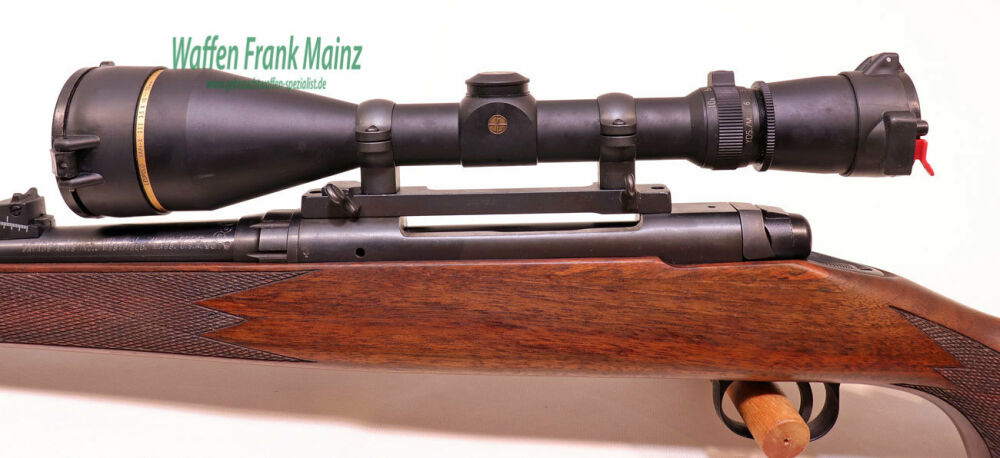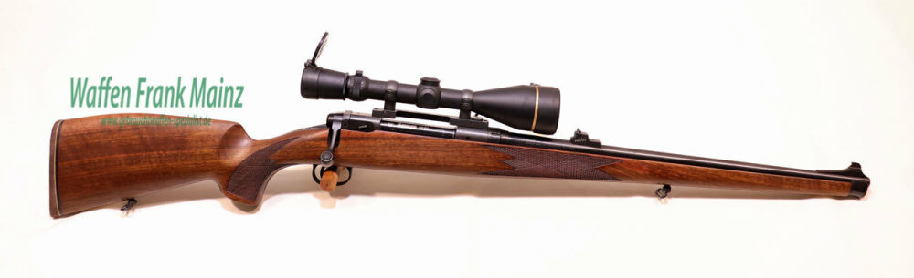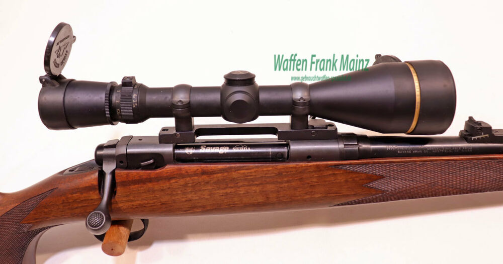 selten geschossene Schrankwaffe, aus Sonderedition für Europa, bei Firma Savage, USA hergestellt, gut gängiger Zylinderverschluss, mit 4+1 Schuss, Feinabzug, verstellbares Fluchtvisier, Ganzschaft mit Metallschnäuzchen, gut gemasert, mit langgezogener bayrischer Backe für Rechtsschützen, Schaftlänge 360mm, eingelegte Monogrammsilberplatte noch mit Monogramm des Vorbesitzers im Pistolengriff, (Änderung oder Entfernung gegen Aufpreis möglich), mit Leupold Aufkippmontage und ZF Leupold Vari-X III 3,5-10x50 Absehen 4......auf allen Kontinenten geschätzte, zuverlässige und robuste Universalwaffe.....